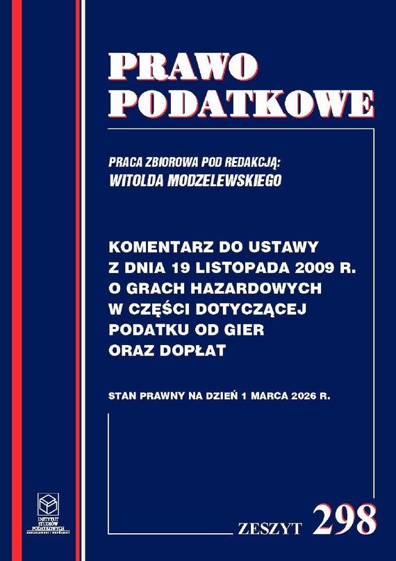 Oddajemy do rąk Czytelników Komentarz do ustawy z dnia 19 listopada 2009r. o grach hazardowych w części dotyczącej podatku od gier oraz dopłat publicznych wprowadzonych ustawą. Podatek od gier oraz dopłaty były jak dotąd tematem rzadko poruszanym w pismach prawniczych. Niniejsza publikacja ma na celu przybliżenie czytelnikowi specyficznej tematyki prawnej podatku od gier oraz dopłat w sposób profesjonalny z uwzględnieniem dorobku interpretacyjnego sądów i organów podatkowych w świetle stanu prawnego obowiązującego na dzień 1 marca 2026 r. Mamy nadzieję że niniejsza publikacja przyczyni się do przybliżenia tematyki podatku od gier i dopłat. Książka powstała przy udziale pracy studentów Wydziału Prawa i Administracji Uniwersytetu Warszawskiego pod opieką merytoryczną prof. dr hab. Witolda Modzelewskiego oraz pracowników Instytutu Studiów Podatkowych. Książka dotyczy stanu prawnego na dzień 1 marca 2026 r.