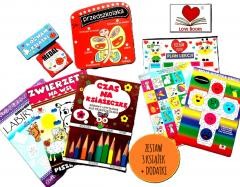 DLA PRZEDSZKOLAKA ZESTAW 3 KSIĄŻEK Z DODATKAMI Super zestaw 3 książek dla dzieci w wieku przedszkolnym. W zestawie następujące książki: ULUBIONE LABIRYNTY DLA DZIECI ZWIERZĘTA NA WSI. TO LUBIĘ! CZAS NA KSIĄŻECZKĘ. ZABAWY UMYSŁOWE DLA PRZEDSZKOLAKA W zestawie dodatkowo znajdują się naklejki, gra Piotruś do wycinania i zabawy, Wycinanka- kostka emocji, plan lekcji i zabawy. Zestaw zapakowany w foliowy worek.