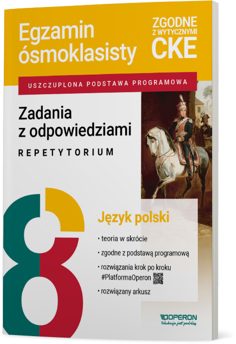 "Publikacja opracowana przez organizatora największych, ogólnopolskich próbnych egzaminów w Polsce. Jedna książka do języka polskiego - wszystko, co niezbędne do egzaminu Chcesz przypomnieć sobie najważniejsze wiadomości podane w skrótowej formie? Być może musisz przećwiczyć rozwiązywanie zadań egzaminacyjnych oraz tworzenie wypowiedzi pisemnych wymaganych na egzaminie, a także sprawdzić odpowiedzi i przeanalizować rozwiązania? Potrzebujesz poznać strukturę arkusza egzaminacyjnego? Teraz zrobisz to wszystko, korzystając tylko z jednej książki. Publikacja"Zadania z odpowiedziami": pomagautrwalić wiedzę i umiejętnościniezbędne na egzaminie ósmoklasisty;. pozwalarozwijać techniki rozwiązywania typowych zadań egzaminacyjnych;. umożliwiaśledzenie postępóworaz stopnia przygotowania do egzaminu z języka polskiego; skutecznieprzygotowuje do zdania egzaminuz języka polskiego.. Co znajdziesz w publikacji "Zadania z odpowiedziami. Egzamin ósmoklasisty 2026. Język polski"? Publikacja"Zadania z odpowiedziami"składa się z się z teorii z ćwiczeniami, zadań egzaminacyjnych do samodzielnego rozwiązania oraz wzorcowo rozwiązanego arkusza egzaminacyjnego. Znajdziesz tutaj też porady, jak radzić sobie ze stresem, i podpowiedzi, jak skutecznie uczyć się do egzaminu. Teoria z ćwiczeniami do każdej wypowiedzi pisemnej wymaganej na egzaminie oraz skrót informacji z zakresu kształcenia językowego i kulturowo-literackiegozawierają najważniejsze wiadomości i praktyczne wskazówki, jak rozwiązywać zadania na egzaminie.. Zadania egzaminacyjne do samodzielnego rozwiązaniaprzygotowano do każdego działu i do każdego typu zadań. Znajdziesz tu zadania kształcące umiejętność tworzeniawypowiedzi pisemnychkrok po kroku, wraz z niezbędnymi zwrotami charakterystycznymi dla danej formy wypowiedzi. Zadań jest tyle, że wystarczą na przećwiczenie różnych typów poleceń i przygotowanie się z danego materiału. Osobny blok tworzą testy przygotowane do konkretnych lektur. Zgromadzone w nich zadania obejmują zarówno kształcenie kulturowo-literackie, jak i językowe. Pełne odpowiedzi do zadań, wraz z etapami dochodzenia do poprawnych rozwiązań i wskazówkami do ich rozwiązania, znajdziesz tu. Wzorcowo rozwiązany arkusz maturalnyprezentuje poprawne odpowiedzi oraz etapy dochodzenia do właściwych rozwiązań zadań z arkusza, ze wskazówkami pozwalającymi uzyskać jak największą liczbę punktów. To nie wszystko. Gdy chcesz sobie przypomnieć szczegóły z podręczników, sięgnij po"Teorię do egzaminu". Być może chcesz sprawdzić się przed egzaminem? Jeżeli tak, to wybierz"Arkusze z rozwiązaniami krok po kroku". Możesz także skorzystać zPlatformy Operon dla ucznia,czyli naszego cyfrowego wsparcia przed egzaminem ósmoklasisty. Znajdziesz tu pełne odpowiedzi do wszystkich zadań wraz etapami dochodzenia do rozwiązania."