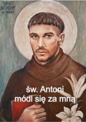 Święty Antoni z Padwy, urodzony jako Fernando Martins de Bulhoes 15 sierpnia 1195 roku w Lizbonie, pochodził z zamożnej rodziny. W młodości wstąpił do zakonu Kanoników Regularnych św. Augustyna, gdzie studiował i przyjął święcenia kapłańskie. Około 1220 roku dołączył do franciszkanów, przyjmując imię Antoni, z zamiarem wyjazdu na misje do Maroka. Z powodu choroby nie dotarł jednak do Afryki i trafił do Włoch, gdzie rozpoczął działalność kaznodziejską. Szybko zasłynął jako niezwykle utalentowany mówca i teolog, a jego kazania przyciągały tłumy. Słynął z głębokiej pobożności, troski o ubogich i chorych oraz wielu cudów jednym z najbardziej znanych było kazanie do ryb, a innym cudowne odzyskanie skradzionej księgi, co przyczyniło się do tego, że został patronem osób poszukujących zagubionych rzeczy. Zmarł 13 czerwca 1231 roku w Padwie i niemal natychmiast został kanonizowany już w 1232 roku. W 1946 roku papież Pius XII ogłosił go doktorem Kościoła.