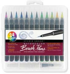 Zestaw pisaków pędzelkowych. Żywe kolory pieknie się łączą same z siebie lub z pomocą dołączonego wodnego pisaka pędzelkowego. Końcówki pisaków wykonano z delikatnego nylonowego włosia. Zestaw zawiera 24 kolory. Wytrzymałe plastikowe opakowanie o wymiarach 18,4 x 18,4 x 3,1 cm.