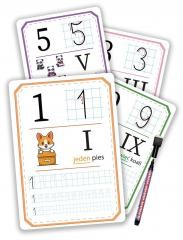Cyferki na kartach są podzielone na drukowane, pisane oraz rzymskie - pomoże to dziecku oswoić się z tym podziałem i ułatwi jego zapamiętanie.
