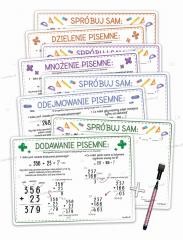 Przednia strona to objaśnienie jak wykonywać działania pisemne z zakresu dodawania, odejmowania, mnożenia i dzielenia. Strona tylna to puste pola do utrwalania i ćwiczenia działań.