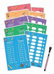 Przednia strona to pełna tabliczka mnożenia w zakresie do 100, strona tylna to 8 pustych pól do utrwalania i ćwiczenia działań.