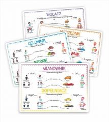 Zestaw zawiera 4 kolorowe karty, na których znajdziemy 7 przypadków i aż po 4 przykłady do każdego z nich! - w liczbie pojedynczej oraz mnogiej.