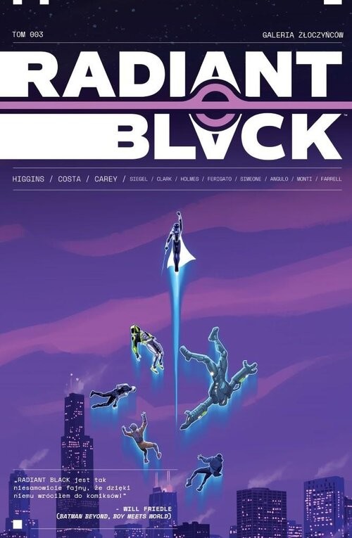 Obcy z mieczem? Załatwione. Najlepszy kumpel? Ocalony. Wielka kosmiczna wojna? Tym można się zająć kiedy indziej. Po rozwiązaniu wszystkich swoich największych problemów Marshall liczy na chwilę oddechu. Ale moc Radiantów nie pozostanie w tajemnicy na zawsze — a ponieważ jego życie osobiste zaczyna się rozpadać, Marshall stanie przed nowymi wrogami, którzy mogą przedwcześnie zakończyć jego karierę superbohatera! Dla fanów INVINCIBLE. NIEZWYCIĘŻONEGO oraz Mighty Morphin Power Rangers nadchodzi odjechany trzeci tom serii od uznanego pisarza KYLE’A HIGGINSA (Ultraman, C.O.W.L.) i rysownika MARCELO COSTY, którzy prezentują kolejnemu pokoleniu nową odsłonę superbohaterów! Zawiera zeszyty RADIANT BLACK #13–18 oraz materiał uzupełniający.