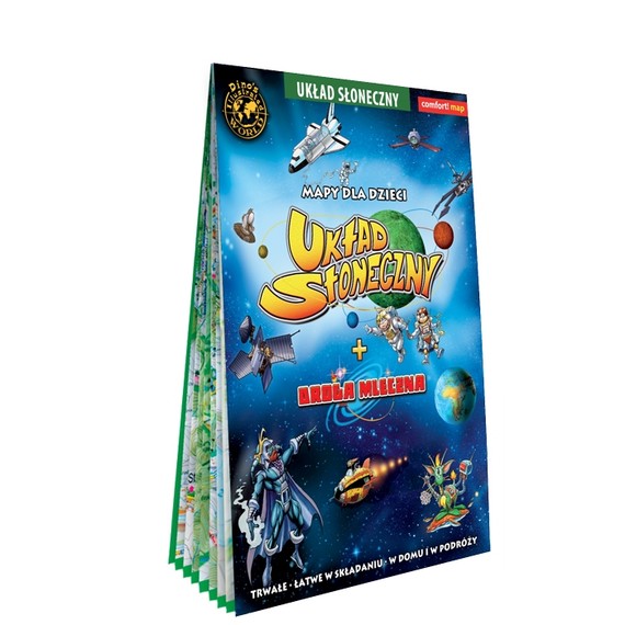 Te zalety doceni każdy rodzic. Układ Słoneczny + Droga Mleczna. Mapy dla dzieci to przydatna i niezwykle interesująca publikacja przedstawiająca planety, księżyce, planetoidy, komety, meteoroidy, a także kilkadziesiąt najsłynniejszych statków kosmicznych: rakiet, wahadłowców, sond i sztucznych satelitów. Mapa zawiera tabelę, w której znajdują się informacje o Słońcu, wszystkich planetach Układu Słonecznego oraz jedynym satelicie Ziemi – Księżycu. Omówienie planet obejmuje m.in. informacje o ich masie, powierzchni, temperaturze, odległości od Słońca, czasie, w jakim obracają się wokół niego oraz dookoła własnej osi, a także liczbie naturalnych satelitów.