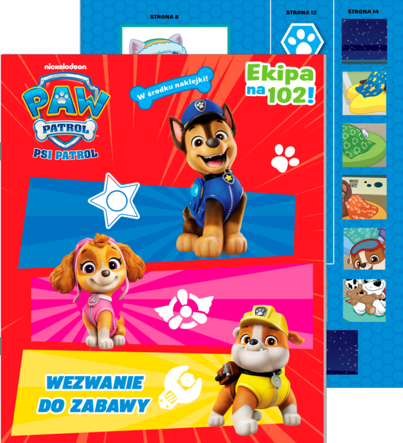 "Psi Patrol. Ekipa na 102!" zawiera zagadki, łamigłówki oraz kolorowanki z ulubionymi bohaterami w roli głównej. W środku również kolorowe naklejki z dzielnymi pieskami! Rezolutne szczenięta Marshall, Rubble, Chase, Rocky, Zuma i Skye oraz dziesięcioletni chłopiec Ryder nigdy nie odmówią pomocy potrzebującym-pomagaj pieskom w ich bohaterskiej misji poprzez rozwiązywanie różnorodnych zadań.